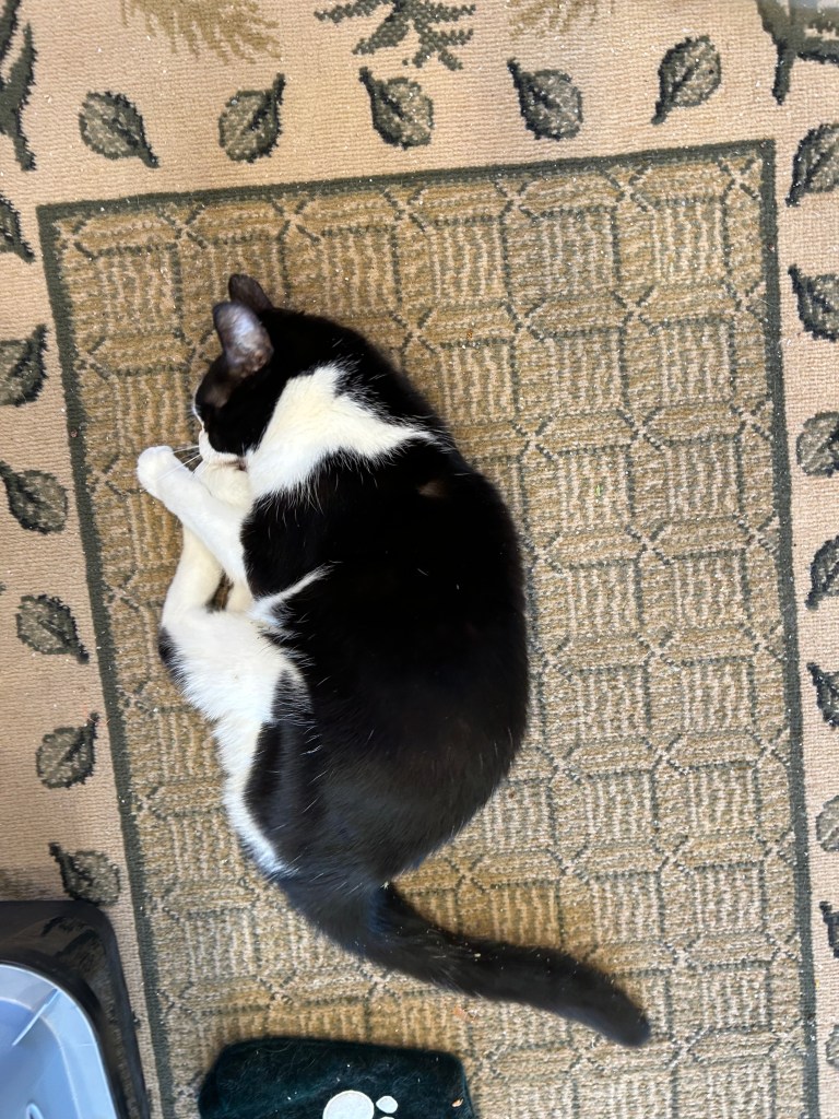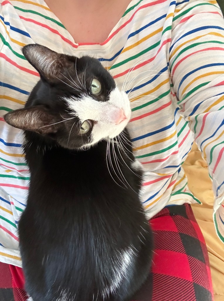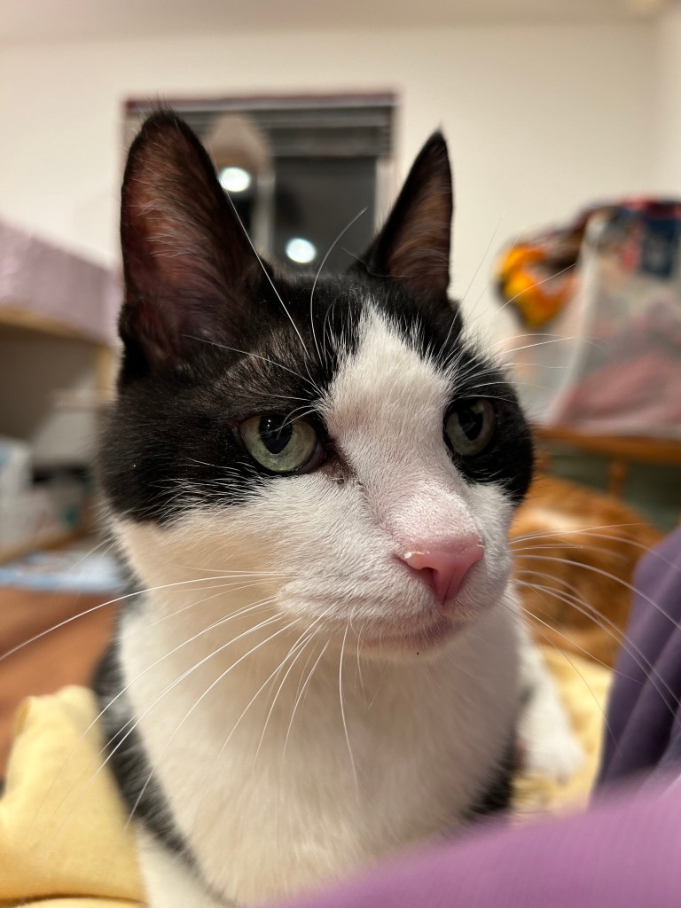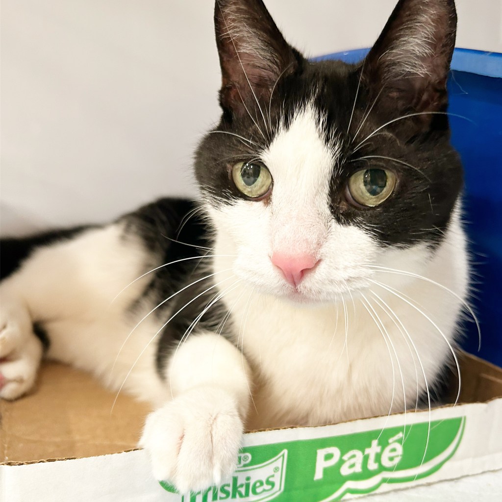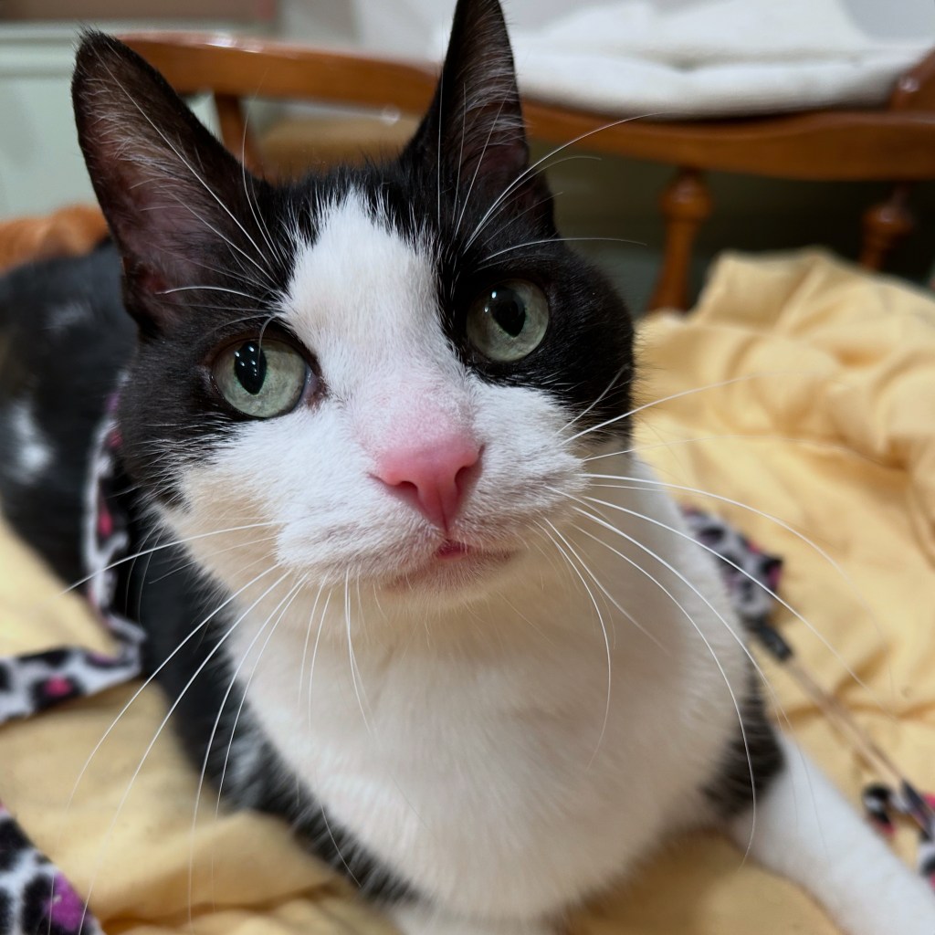 Scooter has hyperthyroidism and takes a pill twice daily. He can be a bit of a door-dasher, sometimes gets under foot and likes to chew plants. Scooter was previously front paw delcawed as a kitten. Scooter asks for “puppies” all the time, and loves to be picked up.