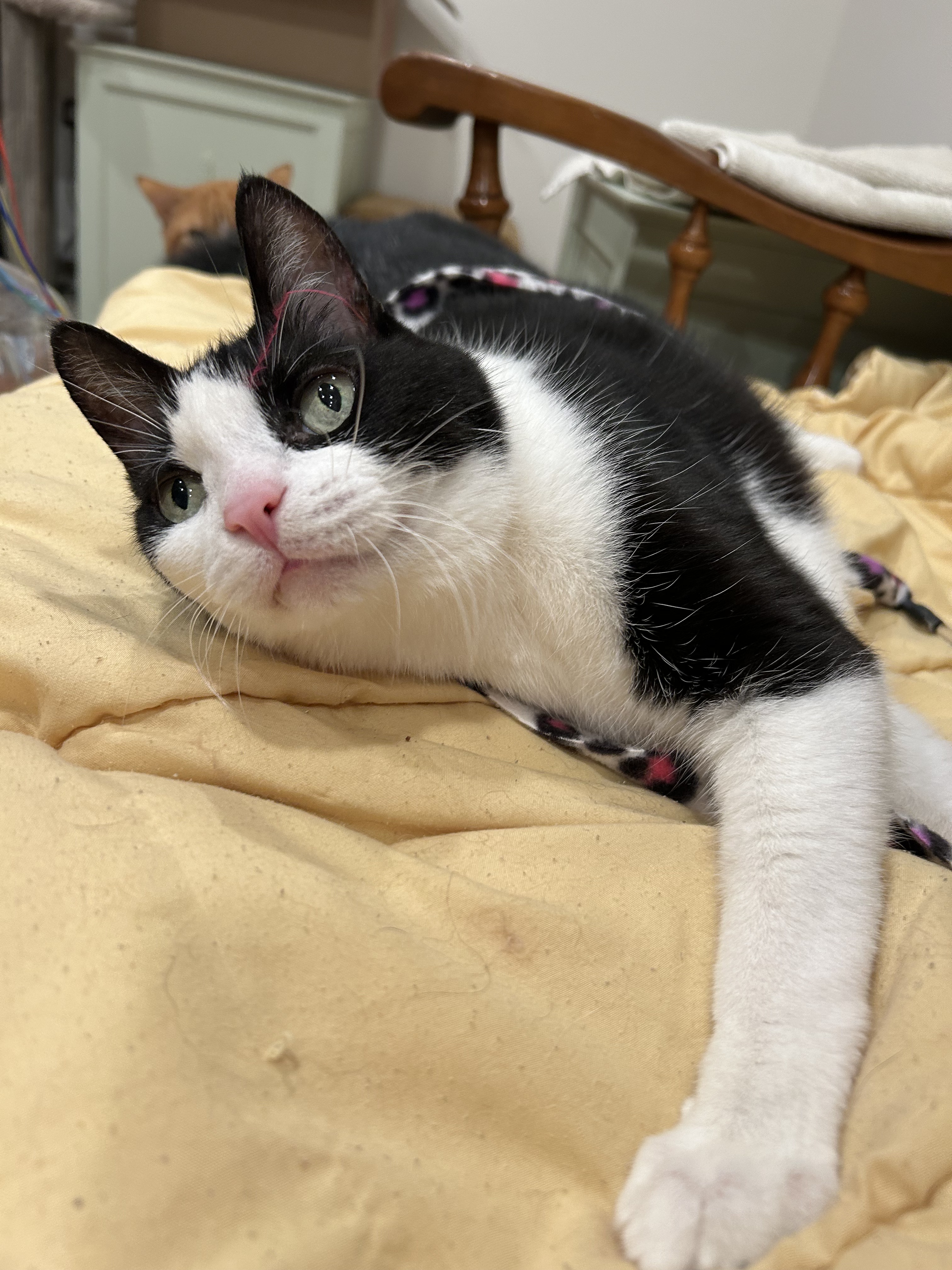 Scooter has hyperthyroidism and takes a pill twice daily. He can be a bit of a door-dasher, sometimes gets under foot and likes to chew plants. Scooter was previously front paw delcawed as a kitten. Scooter asks for “puppies” all the time, and loves to be picked up.