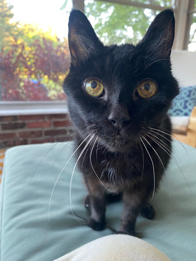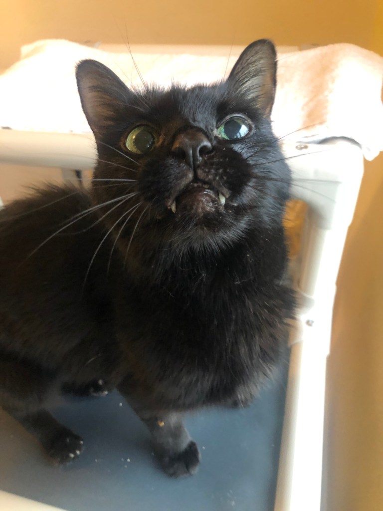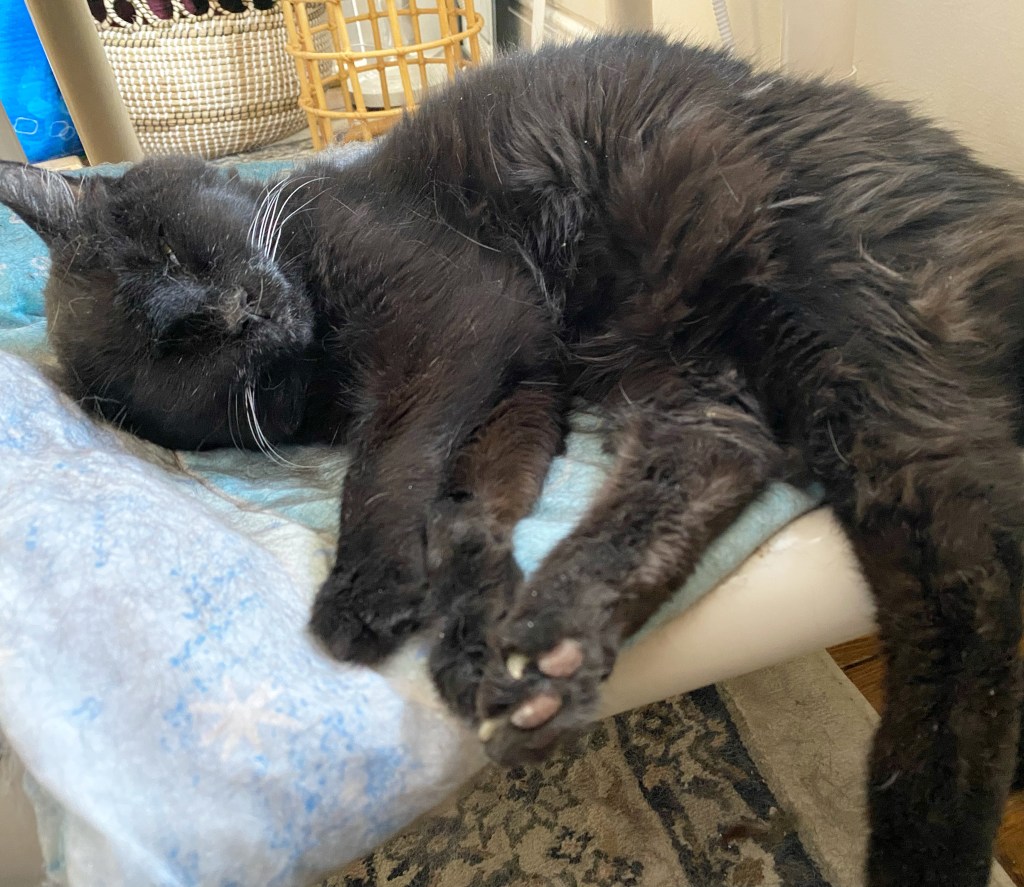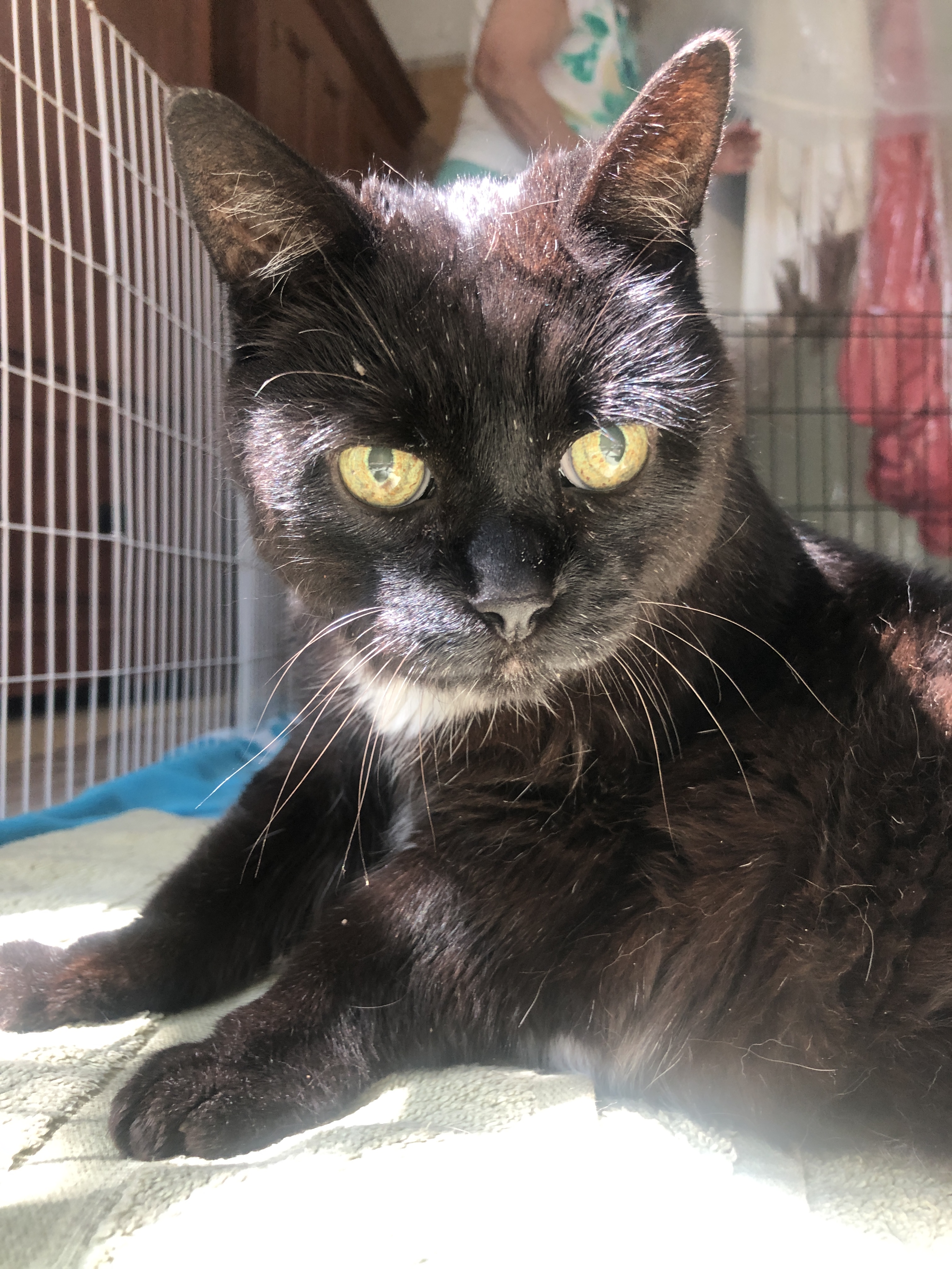Midnight was with us for over 2 years after her person died and she had bounced around to a couple other homes who could not keep her. She had hyperthyroidism, arthritis, high blood pressure, kidney disease and was then diagnosed with cancer. She became a permanent resident. Midnight was very affectionate and confident, liked belly rubs, being brushed and sleeping in sunbeams.