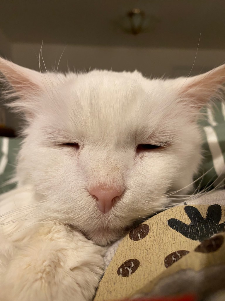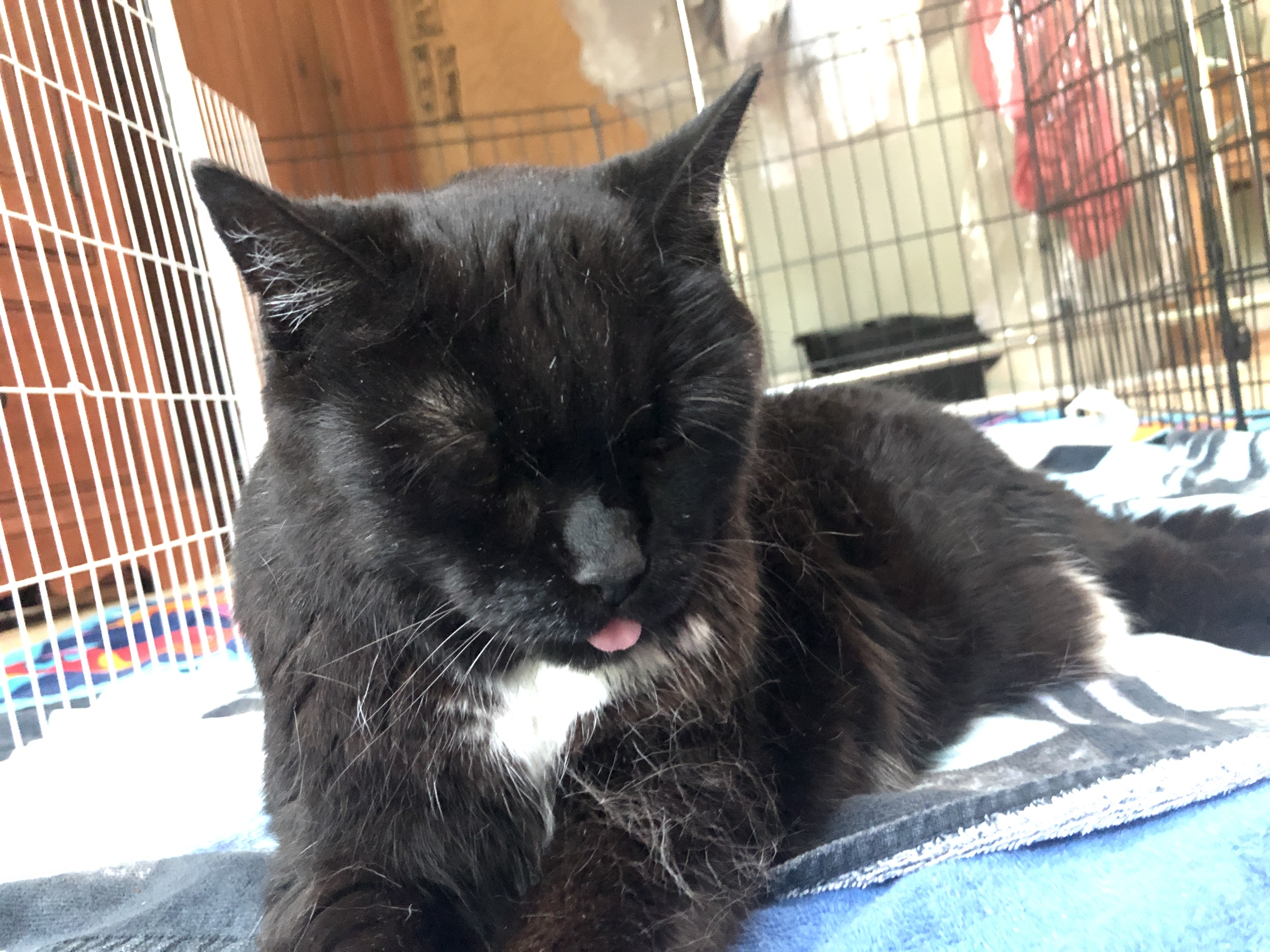 Kaoru (nickname is Kao) was the sweetest kitty we’ve ever met at the Sanctuary! She loved to sleep in a lap for hours and hours and wanted to be with people as much as possible. Kao had some neurological challenges but they didn’t effect her very much. It was the result of a previous stroke. She was blind and deaf, had a high blood pressure and late stage Kidney disease. She also battled pancreatitis and upper resp on and off! Despite her many hospital stays, Kao remained the sweetest kitty ever.