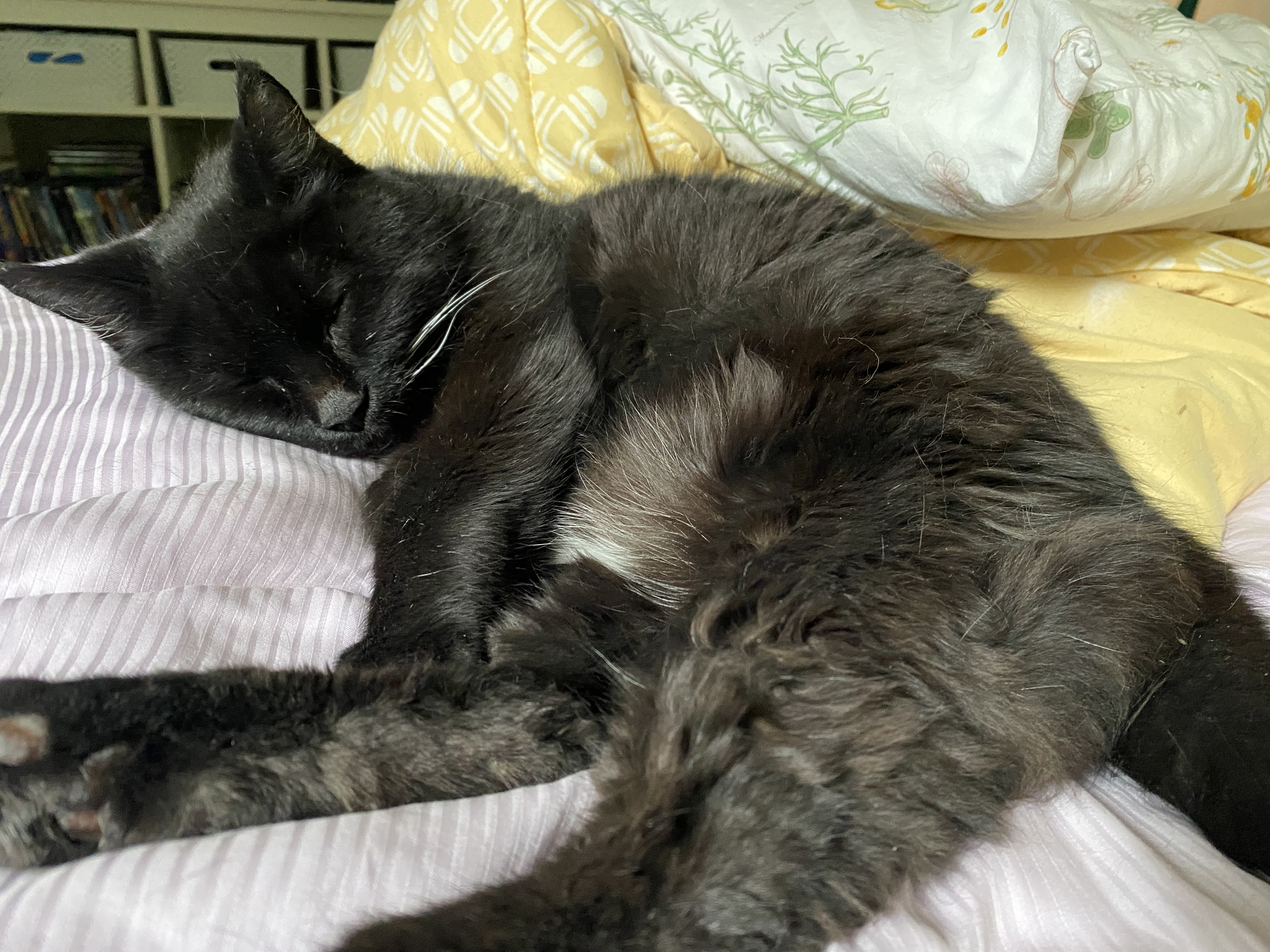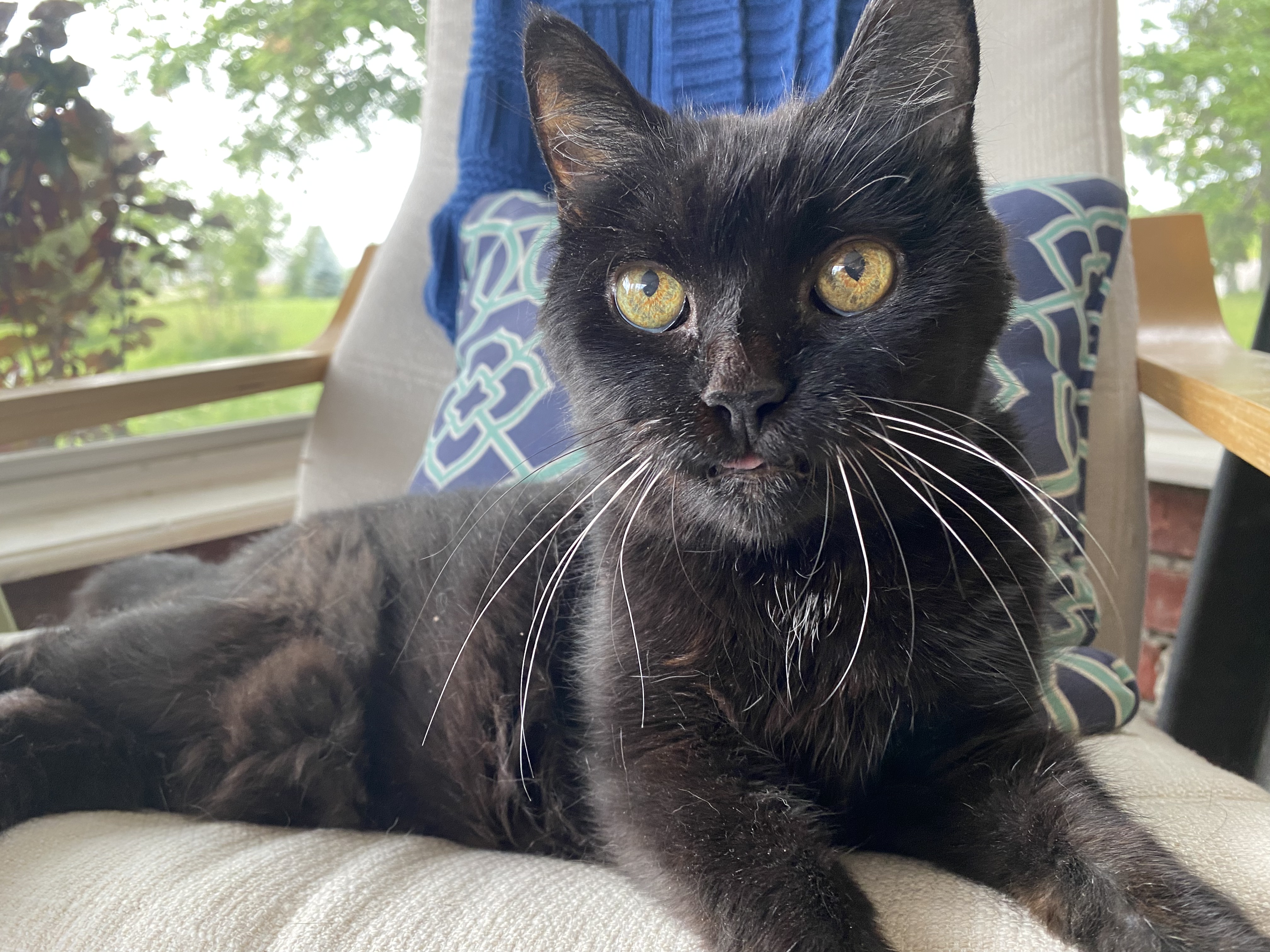 Midnight was with us for over 2 years after her person died and she had bounced around to a couple other homes who could not keep her. She had hyperthyroidism, arthritis, high blood pressure, kidney disease and was then diagnosed with cancer. She became a permanent resident. Midnight was very affectionate and confident, liked belly rubs, being brushed and sleeping in sunbeams.