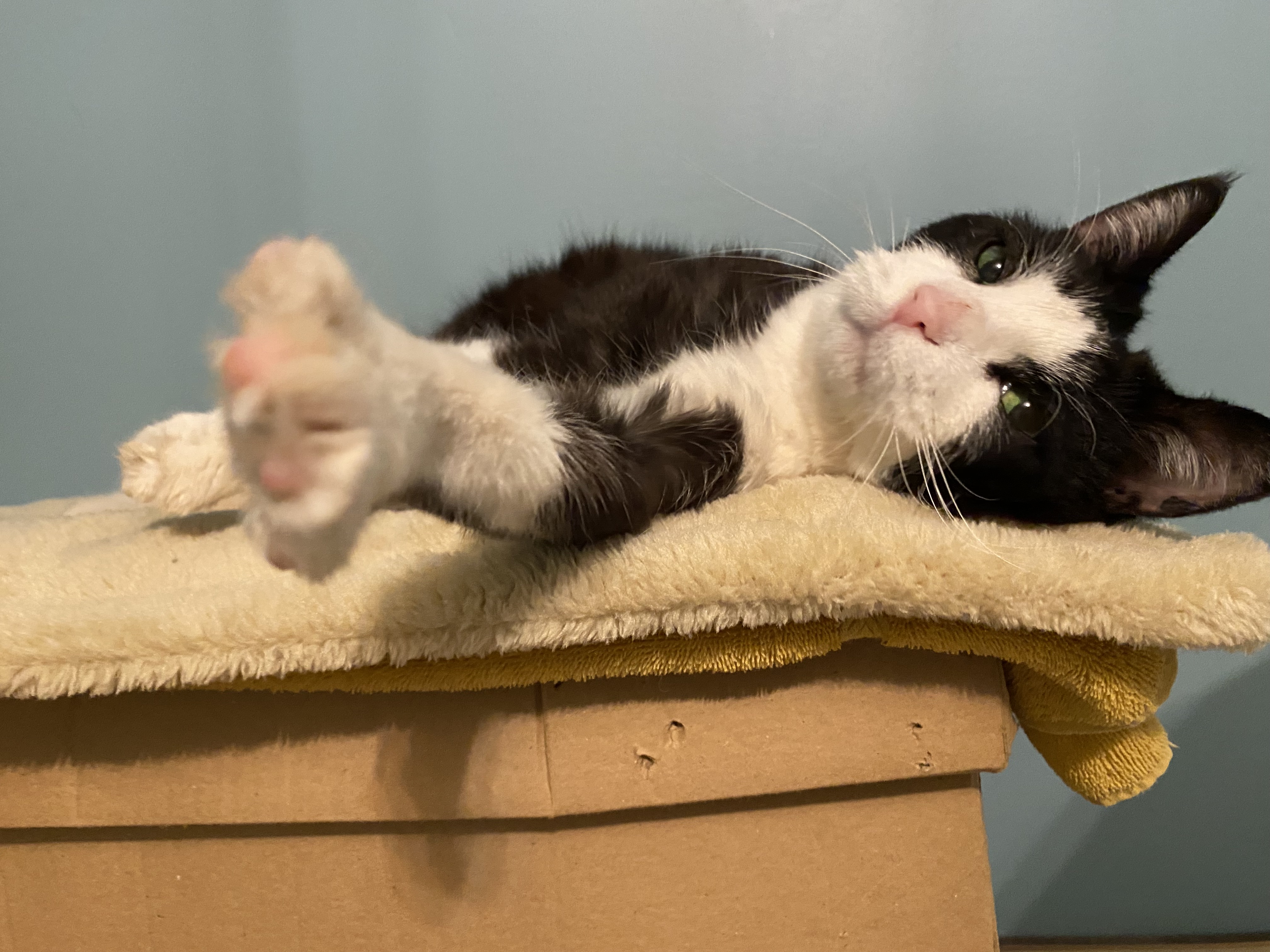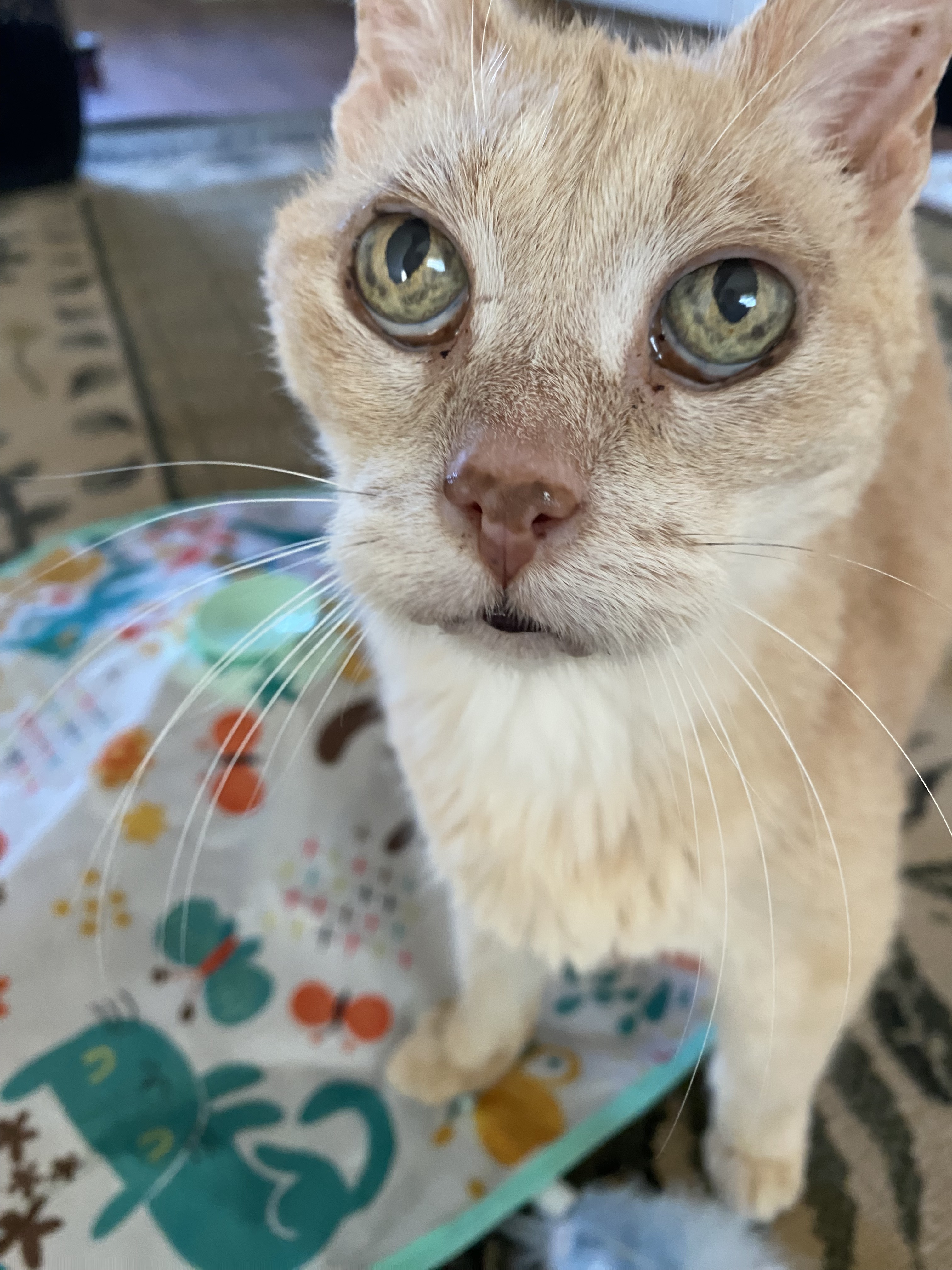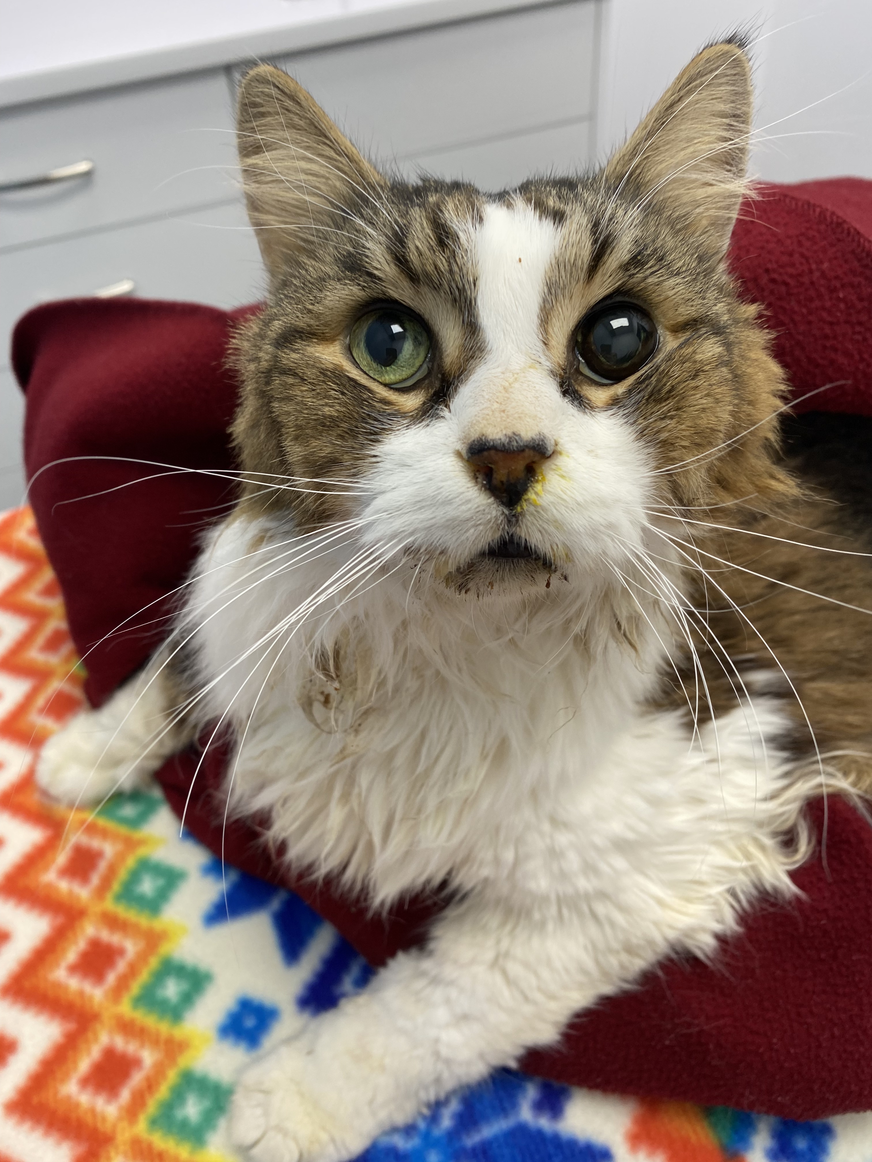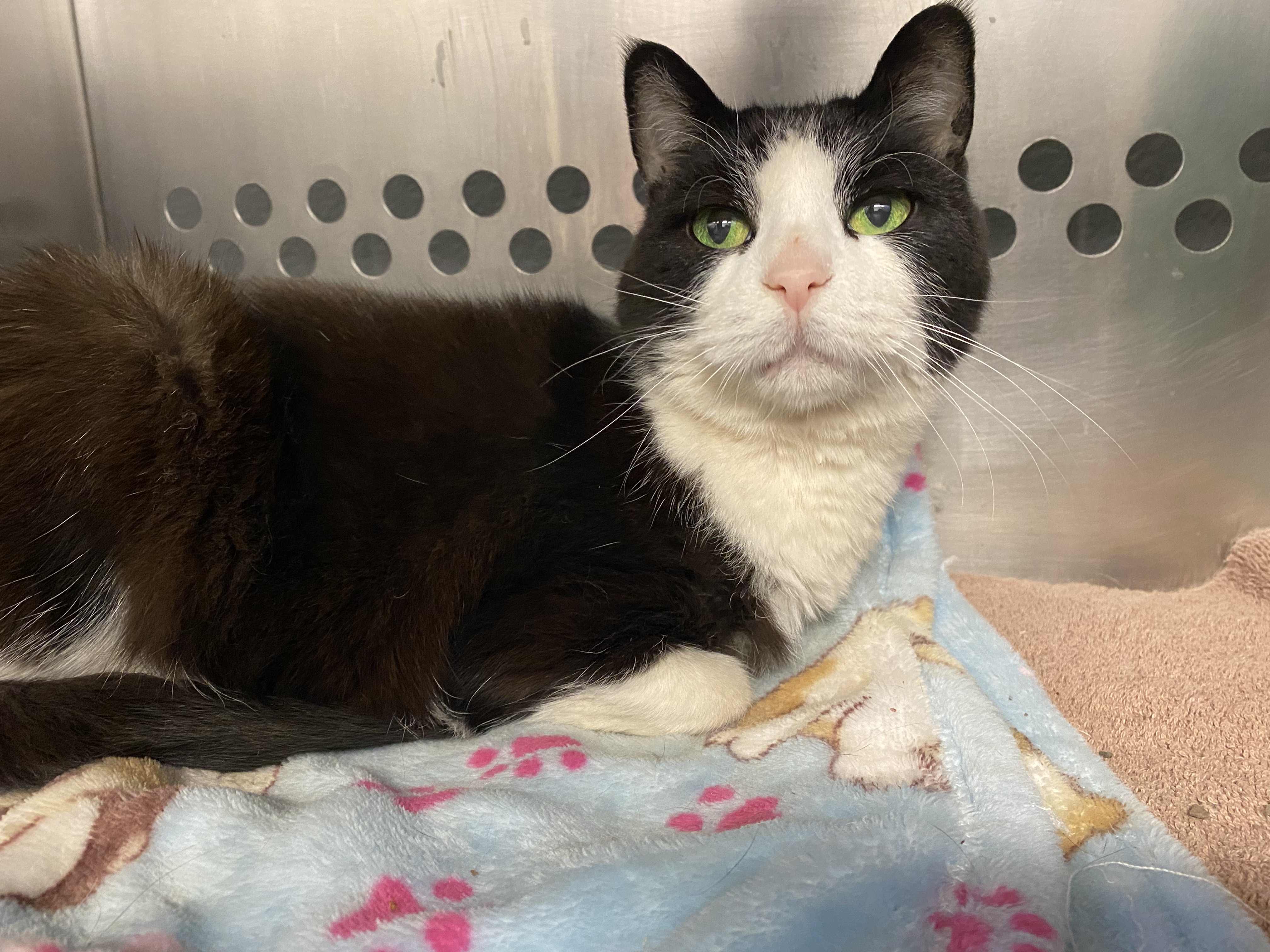 Mikey was 17 years old and came with Chichi when their human needed to go to hospice. He was an incredibly handsome, sweet boy. He loved to play and chase toys. His foster mom would throw toys one by one while he ran after each one and never brought them back! When Mikey came he only weighed 5 pounds due to untreated hyperthyroidism. We got this condition under control but unfortunately his kidney disease progressed rapidly and despite hourly care he declined and could not recover. In his last month with us he opened up so much and started coming up for snuggles and following us around. We’ll miss his loud meow and very quiet purr.