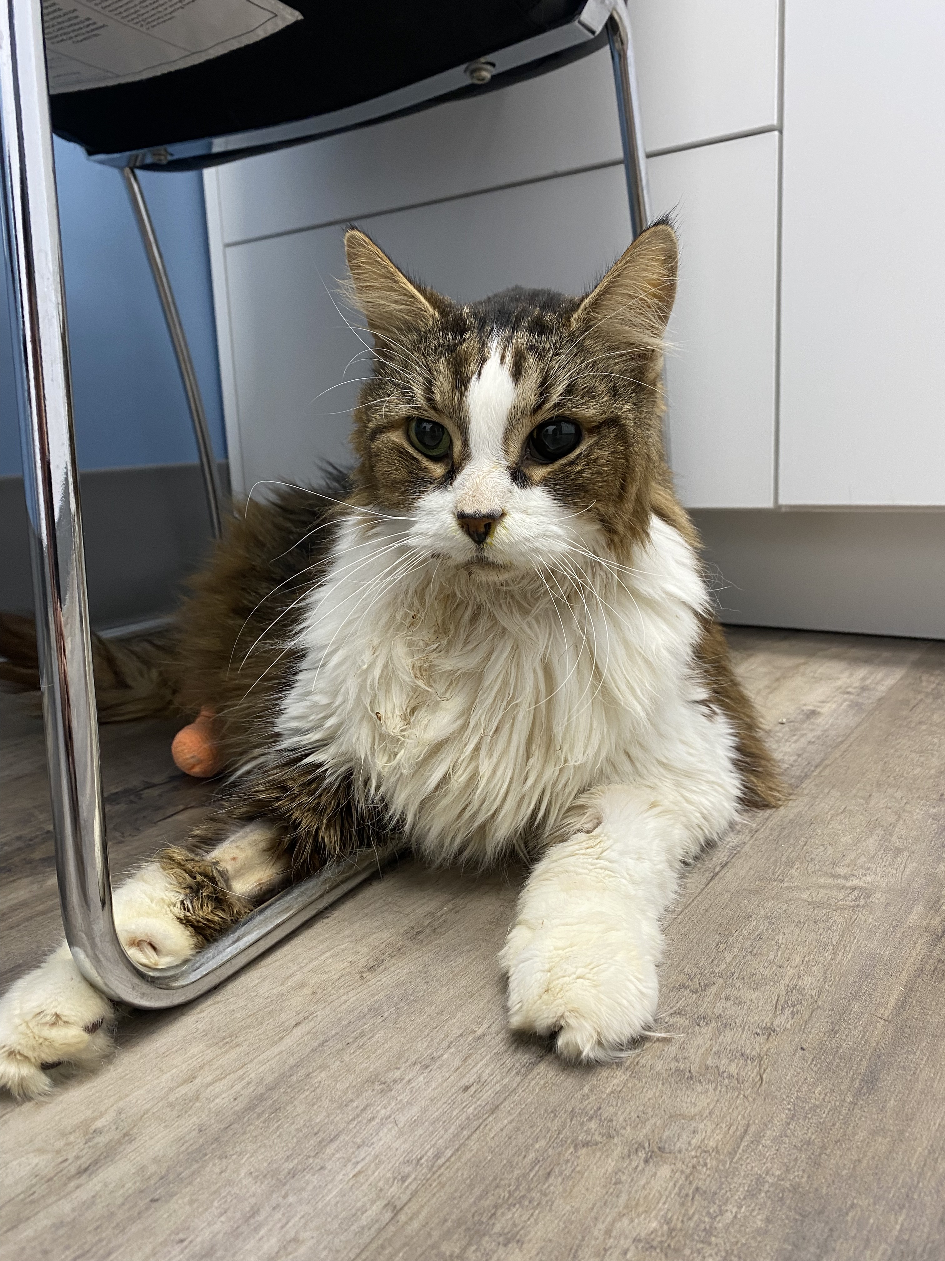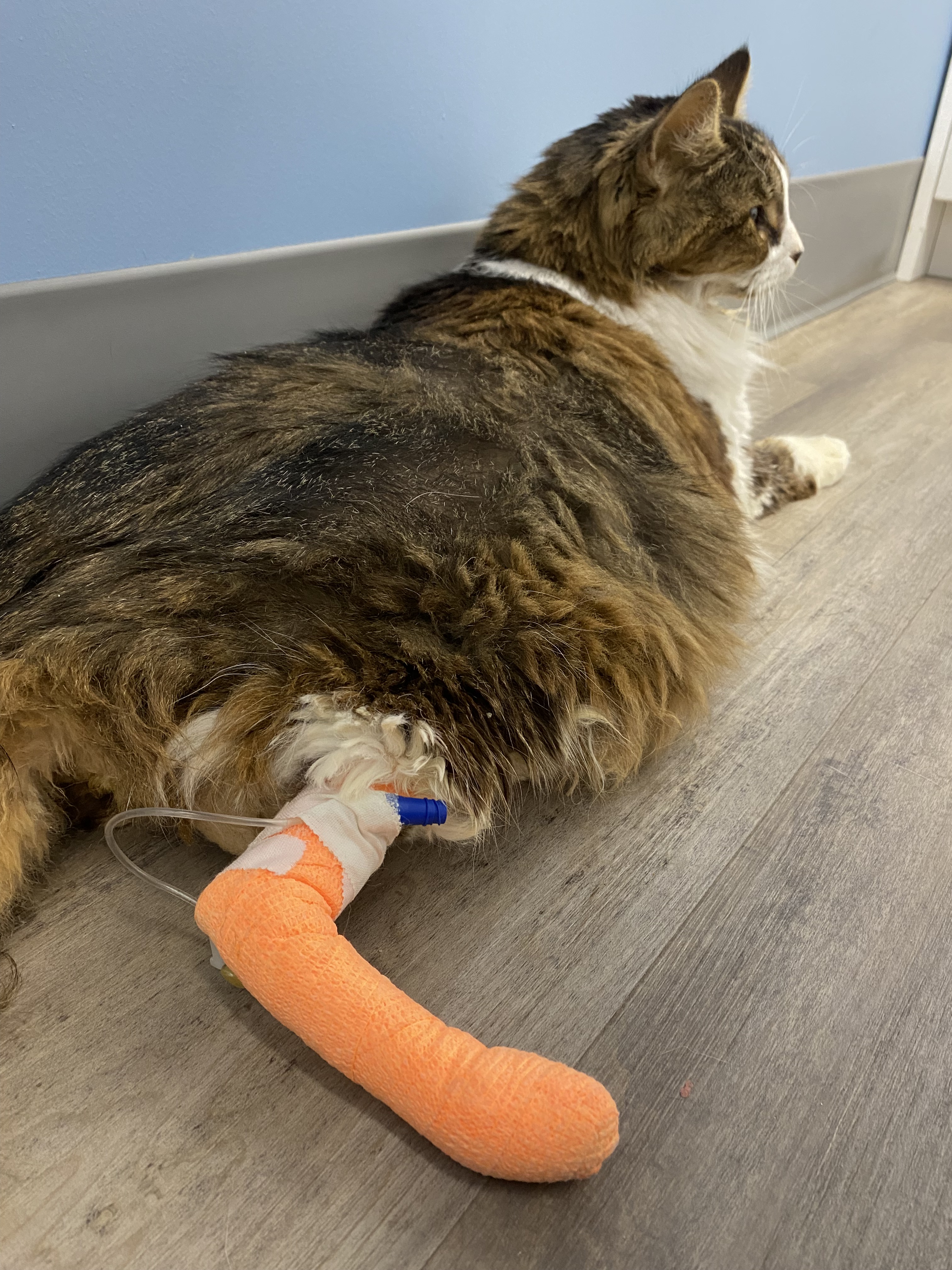 Fergus came when his time was up at a local shelter. He was about 14 years old and overweight. He had been in a home for 3 weeks after his person died without anyone knowing or providing him food. As a result he developed hepatic lipidosis and pancreatitis. We hospitalized Fergus and he was in and out of emergency clinics for the week he as in our care. He received round the clock feedings to try and combat his liver decline but developed multiple complications. We had to make the decision to help him pass. So many people rooted for Fergus and we hope he know how much he was loved.