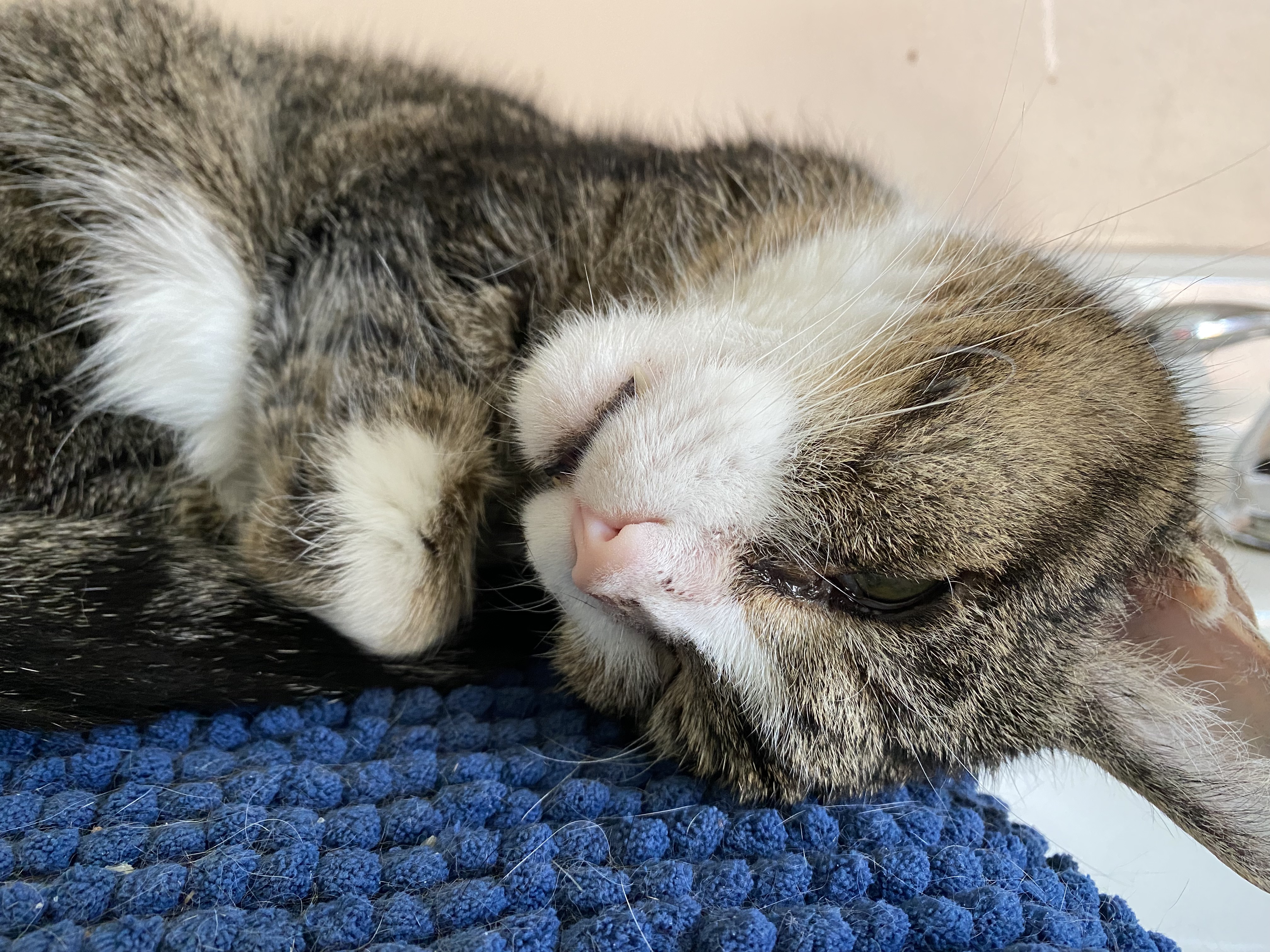 Kaoru (nickname is Kao) was the sweetest kitty we’ve ever met at the Sanctuary! She loved to sleep in a lap for hours and hours and wanted to be with people as much as possible. Kao had some neurological challenges but they didn’t effect her very much. It was the result of a previous stroke. She was blind and deaf, had a high blood pressure and late stage Kidney disease. She also battled pancreatitis and upper resp on and off! Despite her many hospital stays, Kao remained the sweetest kitty ever.