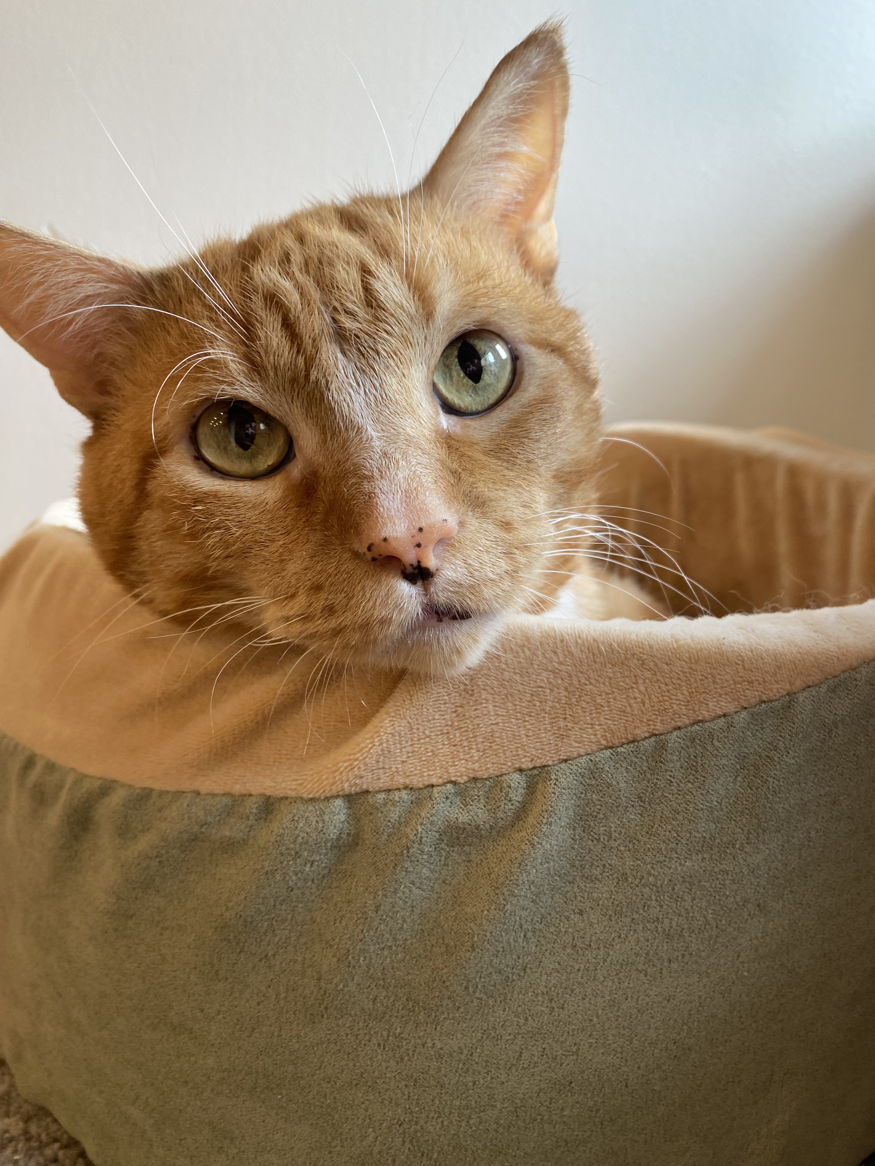 Apple Pie was about 18 years old and was found outside by caring people who brought him to a shelter. He had hyperthyroidism and then it was discovered he had multiple internal masses. This led to anemia which become unmanageable. Apple Pie adored people and would follow you around and sit in your lap as soon as you sat down. He enjoyed playing and had the most gorgeous eyes. He was often found curled up on a heated cat bed.