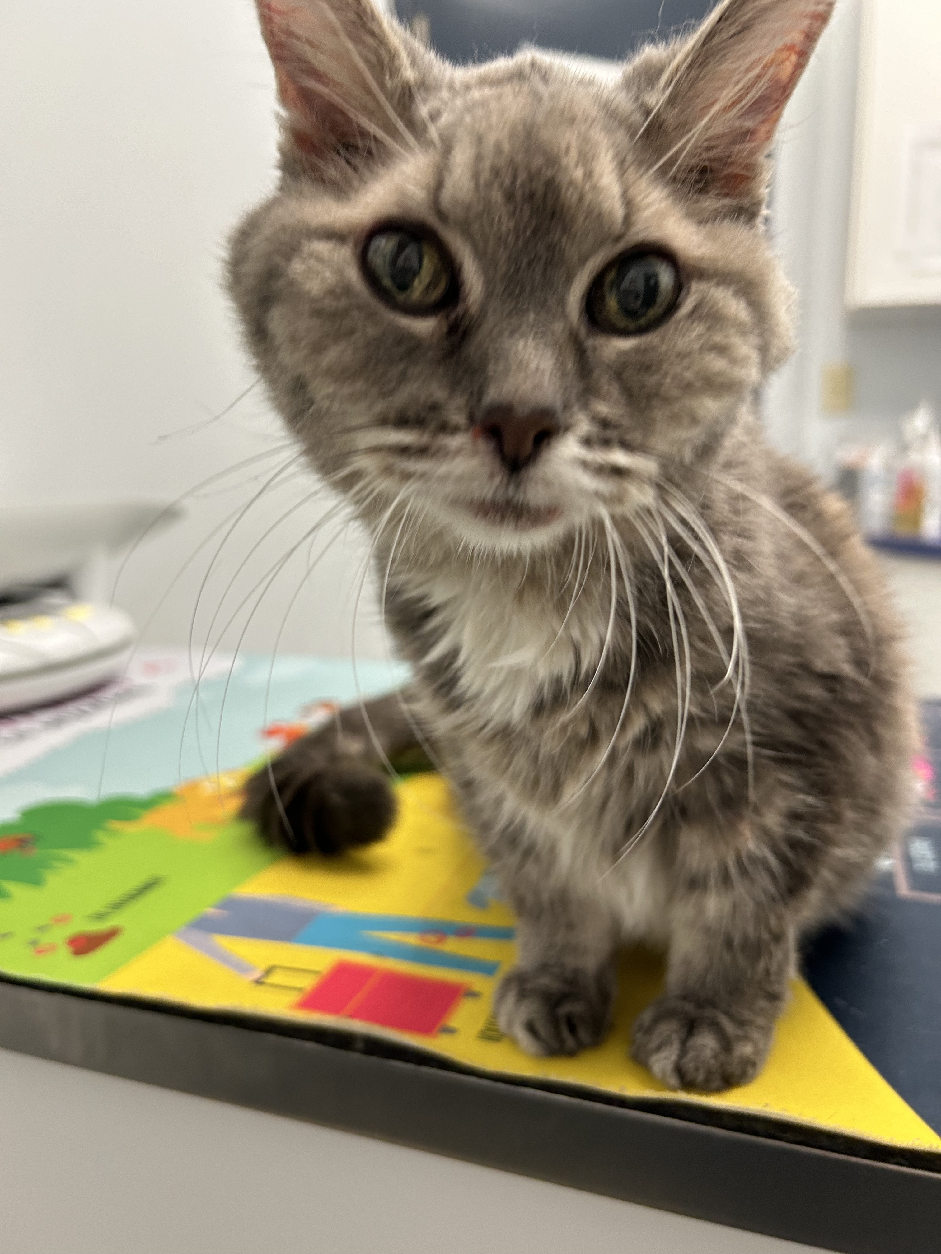 River came to us in February 2024 from a local shelter. She had been found abandoned in a stair well of an apartment building. River had a dental surgery and was slow to wake up after anesthesia. It became clear she had neurological symptoms that were likely the result of a stroke. We cared for her for a week while waiting on a specialist consult and she had another neurological event that left her unable to move. We made the difficult decision to help her pass. River loved head bonks, kisses and splashing in water. She helped her foster mom read by playing with the tassel bookmark.