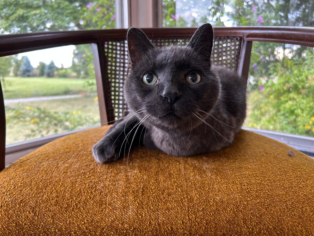 Seamus does show signs of arthritis so he gets a twice daily pill to help with pain management. He can still jump short distances and loves to snooze on cat trees and window ledges. He really loves to look outside and spend time in a screened in porch. Seamus also has kidney disease. At this time he receives a supplement in his wet food and we monitor his bloodwork every 6 months.