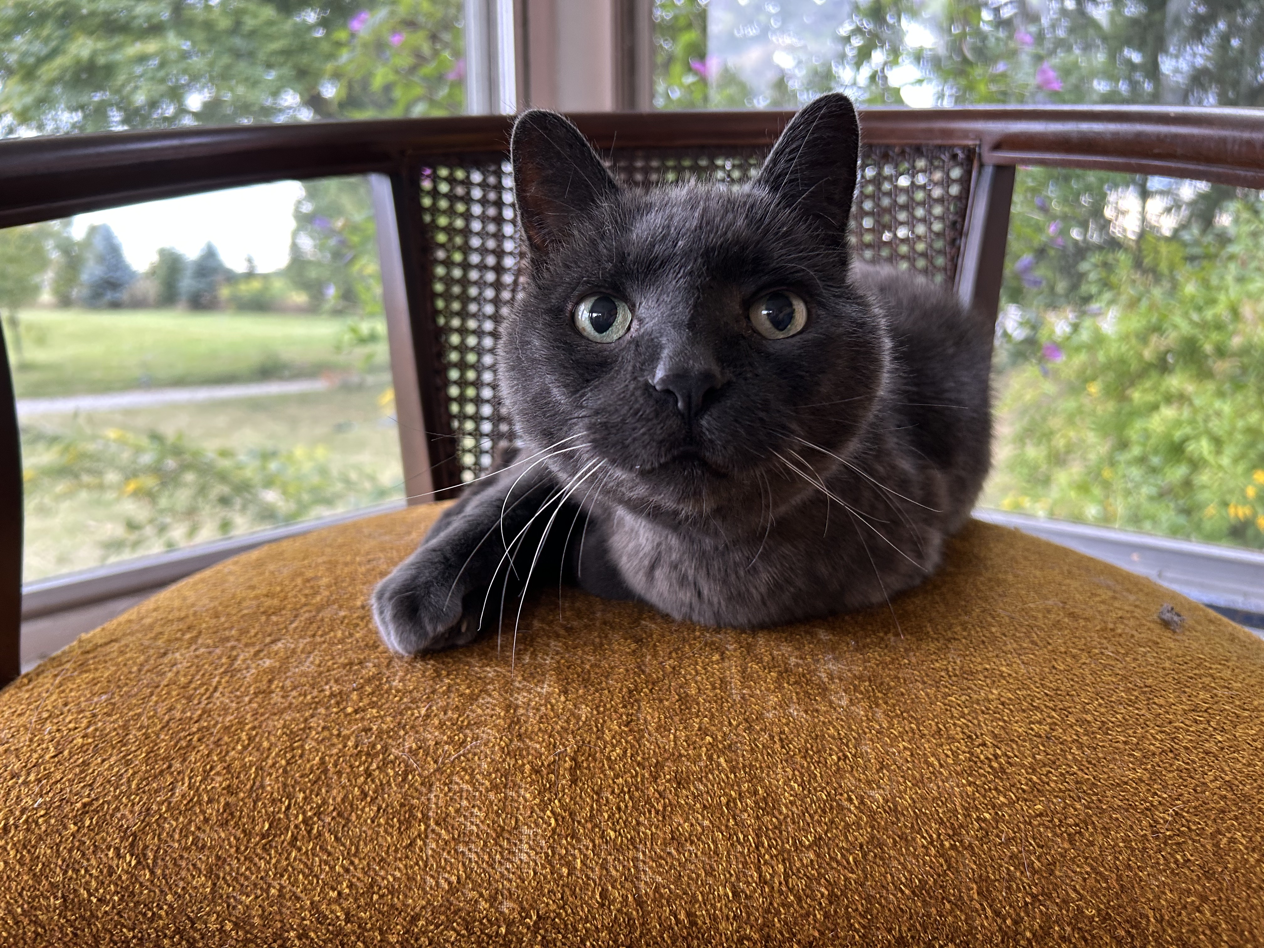Seamus does show signs of arthritis so he gets a twice daily pill to help with pain management. He can still jump short distances and loves to snooze on cat trees and window ledges. He really loves to look outside and spend time in a screened in porch. Seamus also has kidney disease. At this time he receives a supplement in his wet food and we monitor his bloodwork every 6 months.