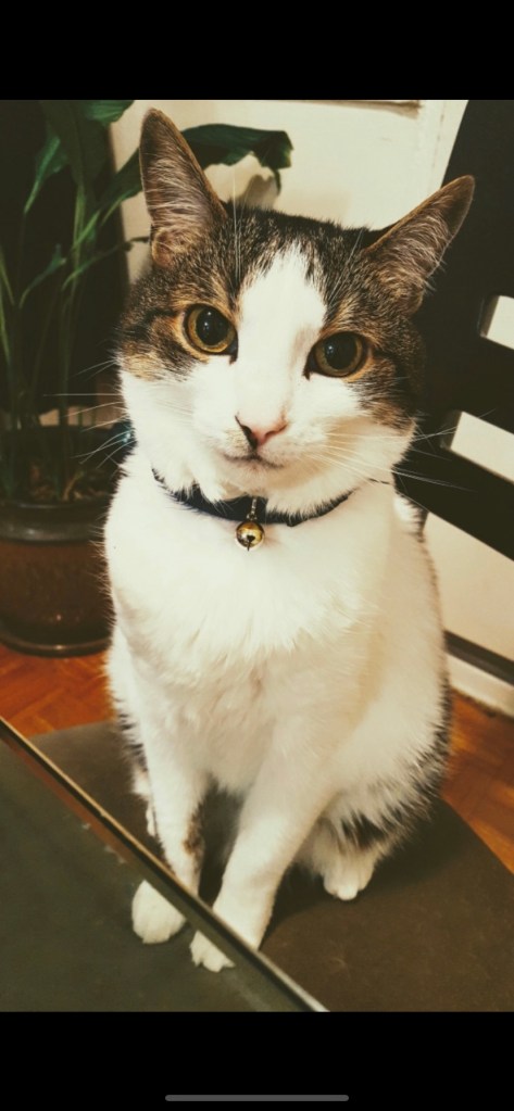 “Chewy is incredibly sweet and chill. He’s sure to make an imprint on your heart, he has so much love to give and all he wants in return is your love and a safe nourishing home environment. He’s not timid and will ask for pets all the time. He loves to cuddle and be close. He purrs a lot! He will follow his humans around the house just because he wants to be with you. He’s got a young spirit but is a seasoned boy ; Chewy is in his golden years and prefers to lounge most of the time, and he plays at a slower pace or in shorter spurts. He’s very calm. He loves to look out the window and sniff the air coming in. Chewy is an indoor cat, though he can be taken outside with his harness, leash, and collar. He loves to watch wildlife documentaries on TV, sleeping in the most blissful & quirky positions, and drinking water with fresh ice cubes. He loves to lay down snuggling on his humans, get chest rubs, and bask in the sunshine. His name is Chewy because he has always had a habit of chewing some things, and will even fake chew to get attention. Therefore, soft plastic must not be within reach. He will also eat elastics, strings, and threads if left within reach.”