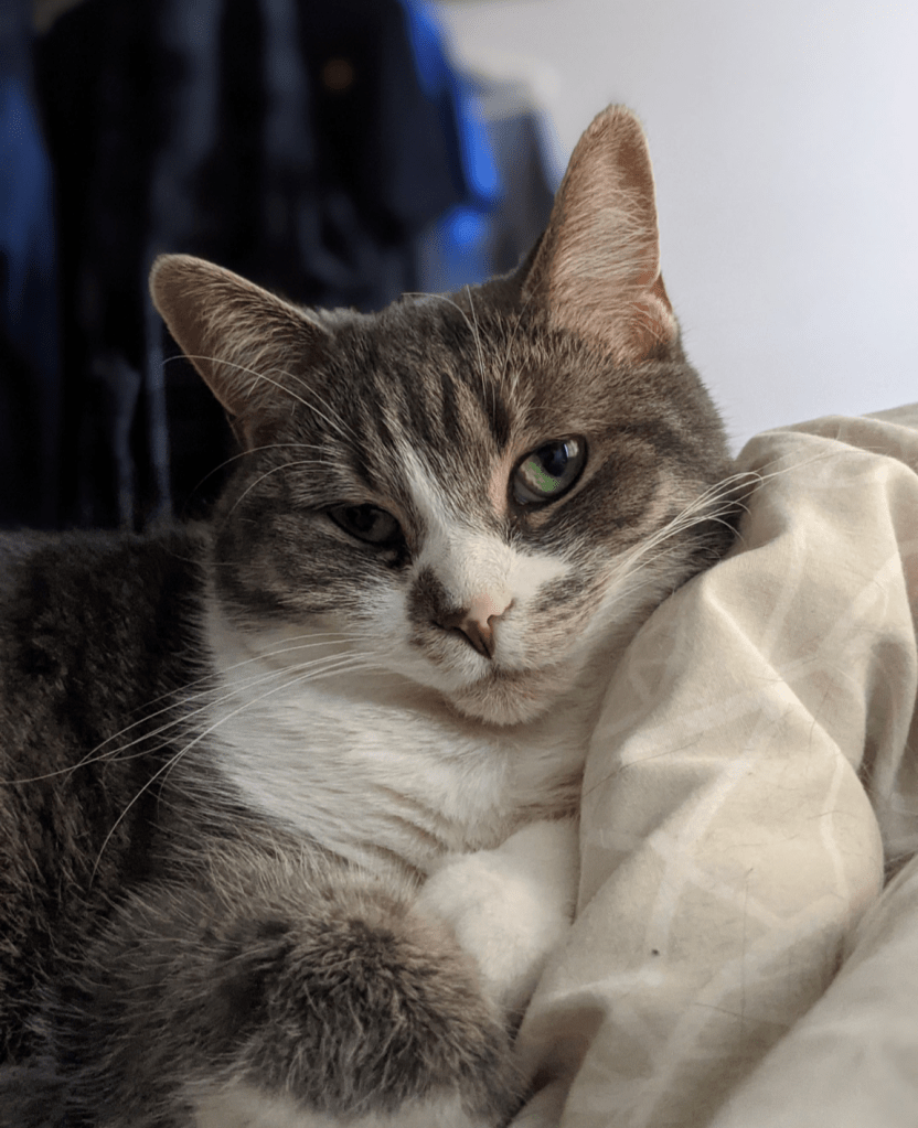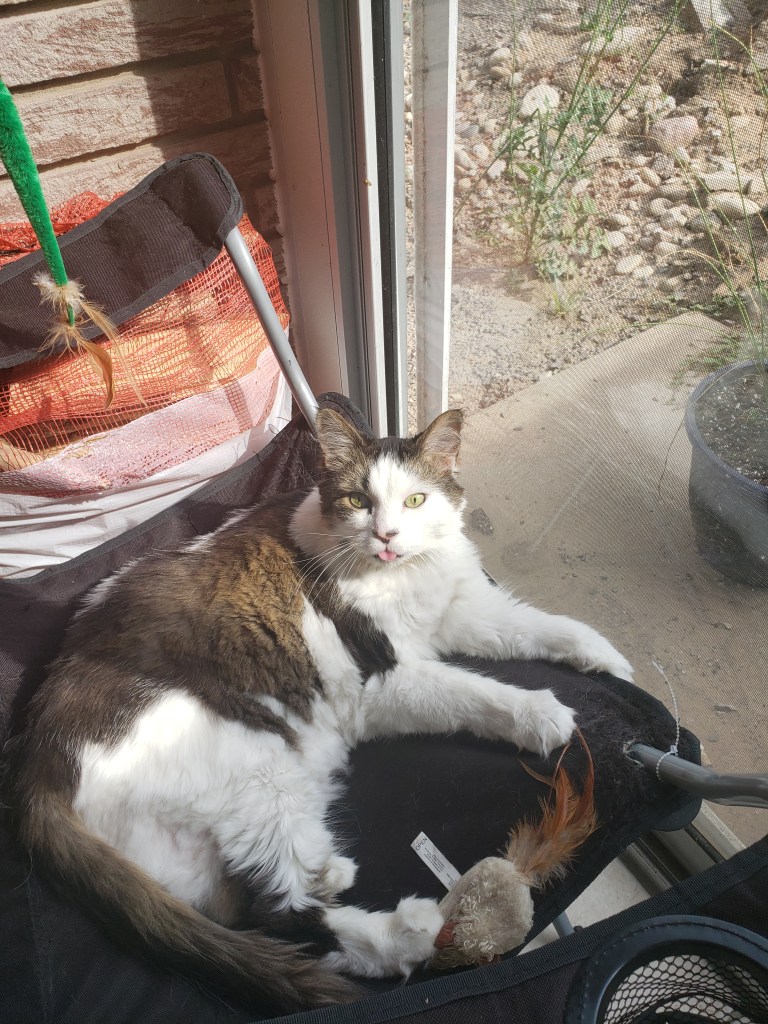 “Jazz aka jazzy jazz. She is a sweet older lady. She loves to bake in the sun and look at the world through a window. The world is fun to look at from the inside however it is way too scary to explore. She is a 100% an indoors lady. She absolutely adores her people. She will knead on your chest during nap time while you scratch her back. She can be shy when people come to visit but warms up quickly. She would prefer to be the only animal in the house. She would be fine with kids.”